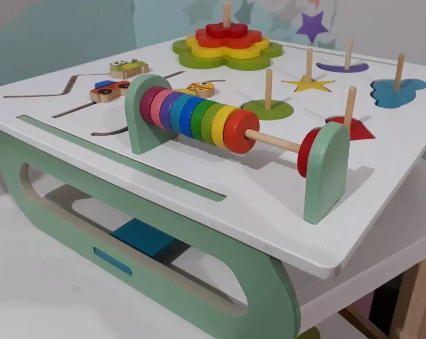 Mesa didactica que incluye 4 actividades para trabajar la motricidad fina, reconocer formas, contar, sentir los diferentes tipos de movimientos simples, descubrir colores, trabajar la precisi¢n encajando las formas en el lugar que corresponde y diferenciar mayor y menor.