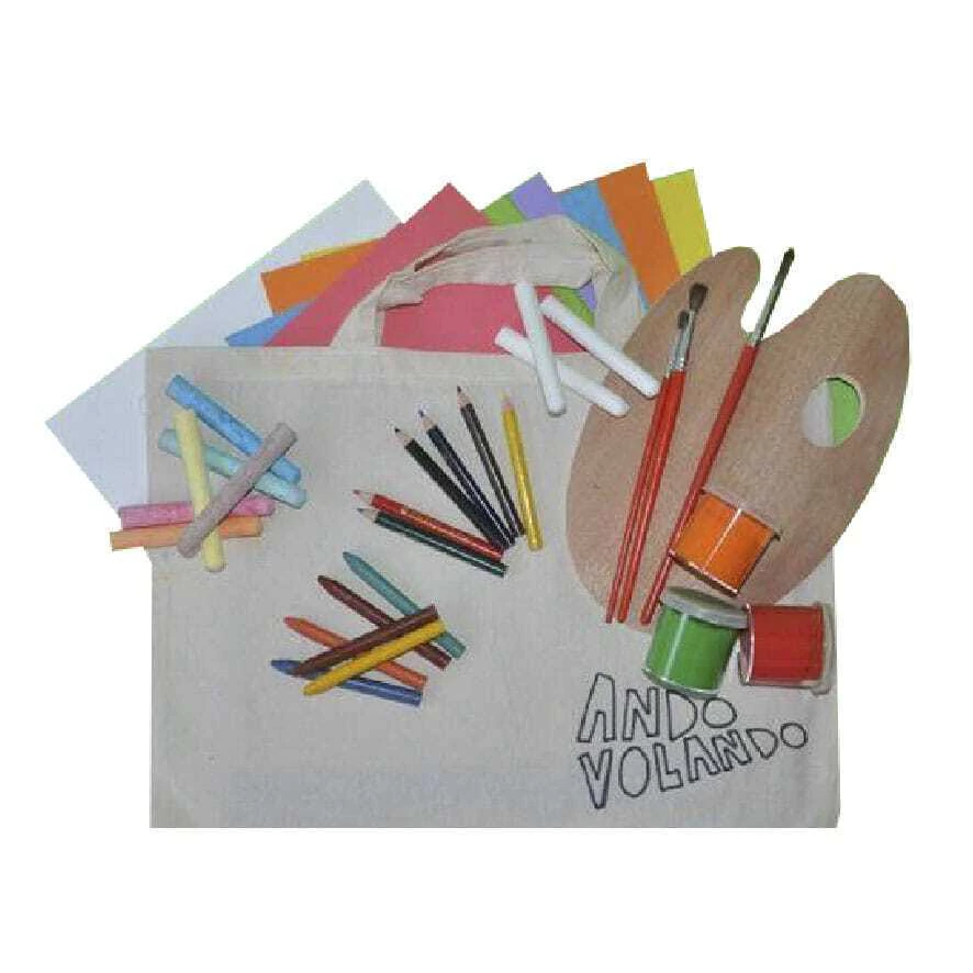 Contenido: Paleta de pintor de madera, 3 pinceles, 3 frasquitos con témpera de colores, una cajita con 6 lápices de colores, una cajita con 6 crayones de colores, 6 hojas blancas, 6 hojas de colores, tizas blancas y de colores.